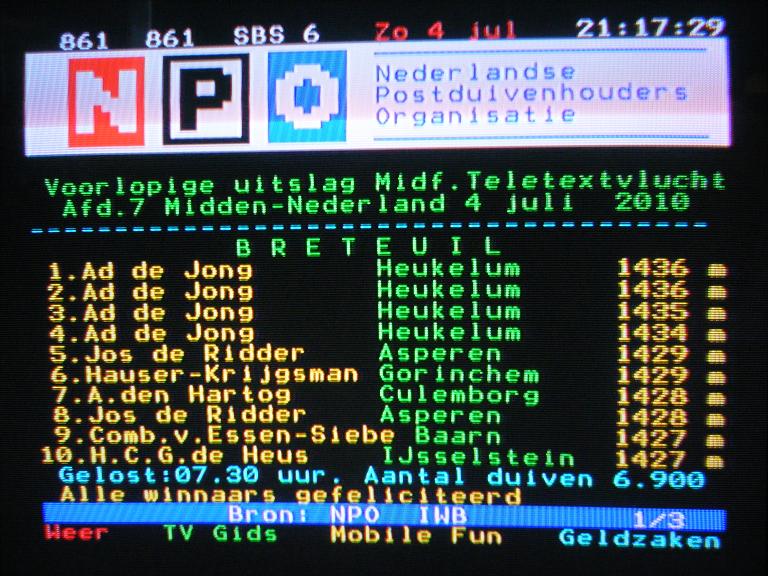 Mooiste teletekst uitslag met 20 duiven mee
