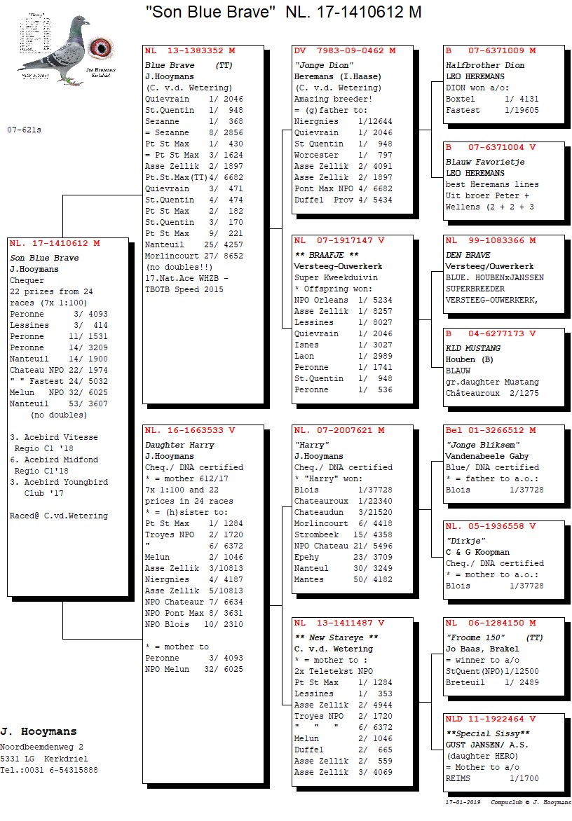 “De volgende kwekers lopen als een rode draad door mijn kolonie: “Stareye” (via J. Baas), “Blue Brave” (Heremans via Ingolf Haase x Versteeg Ouwerkerk), “Strong Trilboy” (via Comb. De Ster) en “New Nationaaltje” (Rinus v Bohemen x Team GPS). Dit alles gekruist met de “Harry”-lijn van Jan Hooymans. Op de hokken van Jan Hooymans en mij bevinden zich nu hetzelfde soort duiven.”, aldus Christian.