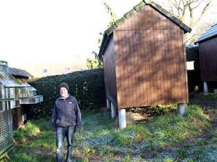 Zijn huidige accommodatie bestaat uit een groot hok met vier afdelingen. Drie ervan zijn bezet door 30 koppels oude duiven en rechts van de ingang een afdeling voor 20 koppels jaarlingen. Naast dit hok en iets terug gelegen een hok eveneens voor 20 koppels jaarlingen. Rechts daarnaast een hok met ren voor ca. 60 vroege en 35 late jonge duiven. Daarnaast weer een hokje voor 12 koppels oude duiven en op de zolder van de garage een hok voor 8 koppels oude duiven. Verder nog een onderkomen voor 12 kweekkoppels en ren voor de weduwduivinnen. Geen van alle hokken is eigenlijk gelijk, doch op alle hokken werd er al goed gepresteerd.