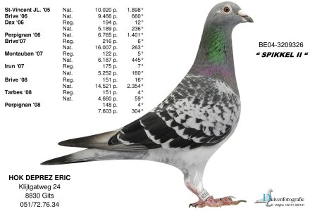 Deze kleine donkere krachtpatser kreeg de naam “Helios” (zonnegod der Grieken) na zijn nationale en internationale overwinning. Als jaarling vloog hij op Agen ZLU-jaarlingen internationaal de prijs 2925 tegen 13.189 duiven. Nationaal miste hij de aansluiting. Daarna vloog hij nog de twee morgenlossingen van de Afdeling t.w. Bergerac en Cahors en won resp. de 410e (1.986 d) - 652e Euregionaal (3.374 d) en de 417e (1.739 d) prijs. Dit jaar ontkende hij met de 347e Limoges (2712 d), 38e Nat Pau (3551 d), 21e St. Vincent ZLU (2.570 d) en nu de 1e Nat. en Intern. Perpignan (3.777d resp. 12.353 d)