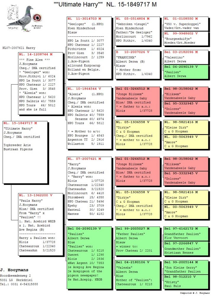 Zie hier de pedigree van “Ultimate Harry”. Alle vier de grootouders van “Ultimate Harry” zijn wereldberoemde duiven die fantastisch gepresteerd én gekweekt hebben.