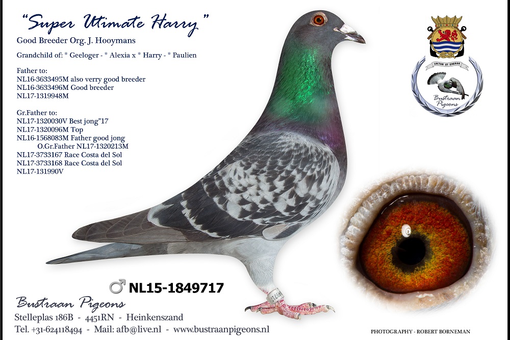 In het vroege voorjaar van 2016 bemachtigde Arie Bustraan Pigeons via Pipa een door ons gekweekte doffer, de NL15-1849717 “Ultimate Harry”. Een prachtige doffer met een super stamkaart waarover hieronder meer. Nu amper anderhalf jaar later zijn er al een hoop goede resultaten behaald met nakweek van deze “Ultimate Harry”…er wordt gezegd “wat goed is komt snel”…