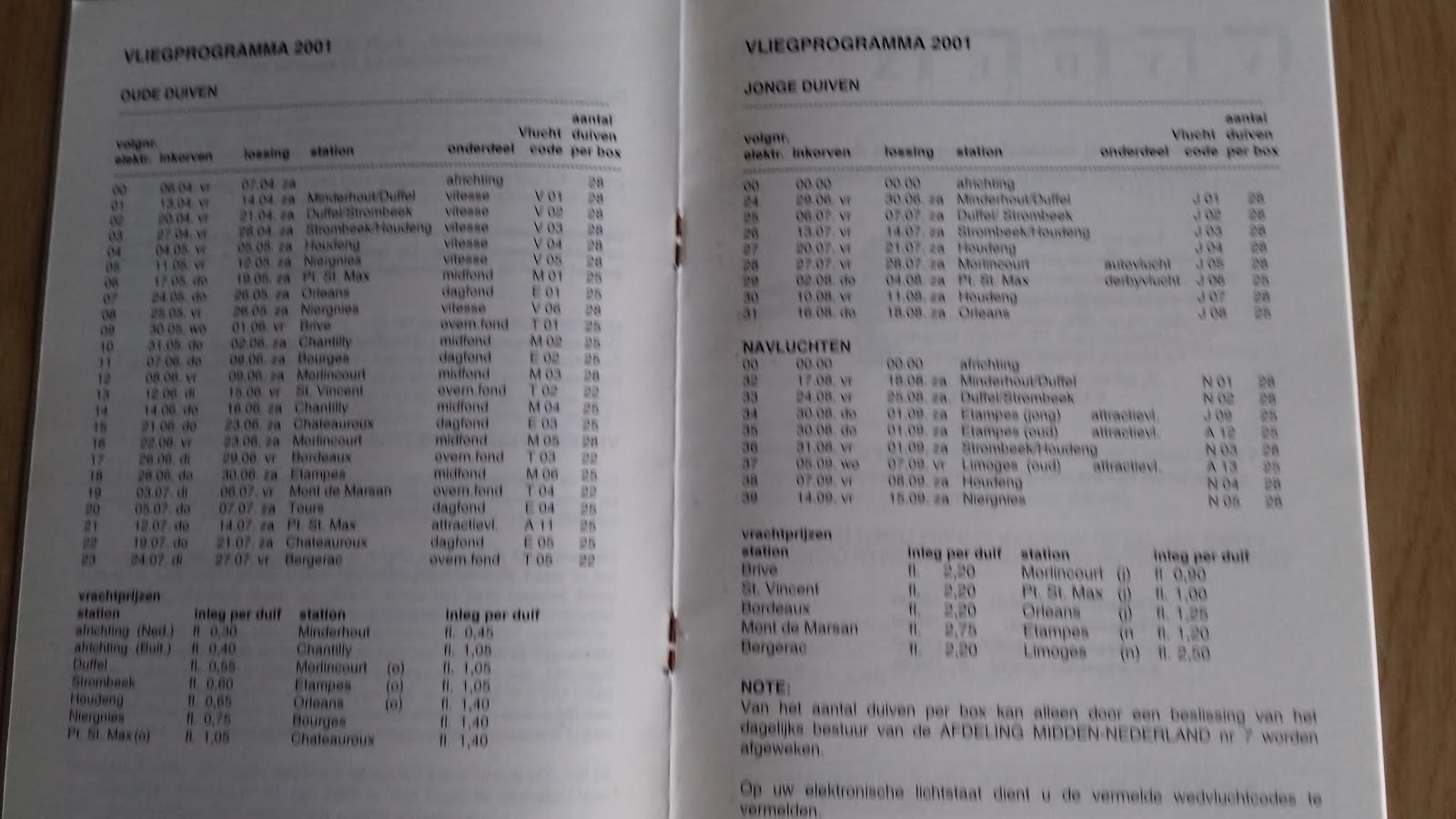 De discussie begint weer over het vliegprogramma. Vorig jaar was het op de schop gegooid en praatte iedere sectie in hun eigen straatje met als resultaat te veel vluchten. Nu wil men het weer geheel omgooien zoals de duivenkrant het Spoor een programma heeft samengesteld. Men praat ook al vanuit de secties om een programma voor 10 jaar vast te stellen. Was dit vorig jaar gebeurd dan zou je er nog 9 jaar aan vast zitten. In het Spoor een voorstel eerst alle vitesse vluchten. De overnacht duiven zouden in 1x van 300 naar minstens 850 km gaan !!! Ook enkele keren een reserve/rust weekend , veel liefhebbers hoor je dan zeggen van rust roest. En met de jongen pas in augustus beginnen. Ik meen dat afdeling 8 of 9 dat enkele jaren geleden ook heeft gedaan maar daar is men snel van terug gekomen. Dat je in augustus geen jongen kwijt raak is ook een fabeltje zoals sommigen beweren. Men raak er ook kwijt net als op de taartvluchten. Ook wil men de duiven meer natuurlijk houden en dan is later beginnen met de jongen geen optie want de rui gaat wel eind augustus beginnen. Ook daarom lijkt het me beter om met de jongen eind mei / begin juni te beginnen. Dan hebben de jongen al de nodige ervaring opgedaan voordat het in juli mogelijk zomers kan worden de komende jaren. Begin je laat en krijg je net voor de jonge duiven vluchten coli dan kan je later niet meer met de natour inspringen. Ik ben niet voor in begin met de jongen iedere week een kort vluchtje , daar raak je de meeste duiven op kwijt. Jonge duiven moeten kilometers maken. Dat veel liefhebbers totaal weduwschap spelen is waar maar wat ik zo hoor gaan steeds meer liefhebbers met alleen doffers of alleen duivinnen spelen met de oude. Dit omdat de sport te duur wordt. De wederhelft kan dan mee op de natour. Wat er ook uit komt wat het vliegprogramma betreft zet het nooit voor 10 jaar vast. Misschien moeten we over enkele jaren wel in januari / februari beginnen omdat het in de zomer te heet wordt. Had nog een boekje liggen van 2001 van afdeling 7. In kring Teyterbant had men met de jongen na Orléans nog Chateauroux en Bourges. Ik zou nu liever 4 weken eerder met de jongen beginnen dan op dit programma van 2001 staat met grotere stappen met meer kilometers. Het is meestal zo van zoveel liefhebbers zoveel meningen. Zoals ook nu weer blijkt zijn alle veranderingen geen verbeteringen. Klik op de foto dan wordt het vergroot , de vracht prijzen zijn nog in de oude vertrouwde gulden.