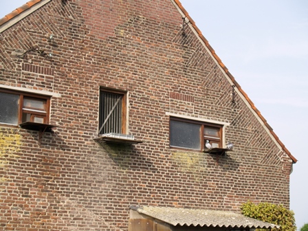 hij zelf woont er naast in een nieuwe bungalow.  De bedrijfsruimten heeft hij wel verhuurd, Wel verbouwd hij nog elk jaar zijn eigen gerst en mais.en tarwe. Onder het motto; ik moet toch wat te doen hebben, maar de achterliggende gedachte is natuurlijk de kwaliteit van de granen. Hier heeft hij een wakend oog voor. . Charles die voorheen in Thorn gewoond en duiven gespeeld heeft , woont hier op een prachtige locatie tegen de Belgische grens. Ruimte in overvloed, in zijn voormalige bovenverdieping van zijn oude boerderij zijn nu op de zolder  ruime hokken gebouwd , en de invliegramen zie je aan elke kant van de gevel dus op 3 zijden van deze woning zien we in de bovenzijde invliegramen , Op de zolders hiervan heeft hij royale zolderhokken gebouwd die plaats bieden aan 35 koppels  De gehele bovenverdieping is een en al duiven verblijf, met voor elke categorie wel twee afdelingen .  ruimte in overvloed.  Op de bovenverdieping zien we de hokken zo gebouwd en de verluchting is net zo pienter aangepast. Onder de dakplaten is een balklaag die ruimte bied van ongeveer 10 cm . deze doorlaat zorgt ervoor dat de lucht in voldoende mate binnen kan. Het raam op de zij kant staat bijna altijd open , en is zodanig gesitueerd Dit de hele bovenverdieping goed kan luchten.  Toch zijn de bakken niet elk jaar allemaal gevuld, duiven die hier overwinteren moeten hun kost verdiend hebben..