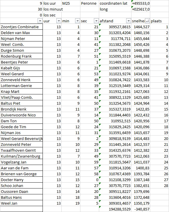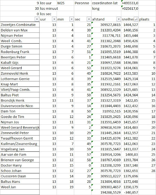 De vlucht werd gewonnen door de combinatie Zoontjes, vorige week zaten zij er al dichtbij maar nu pakken ze de hoofdprijs. Henk en Wim van harte gefeliciteerd.