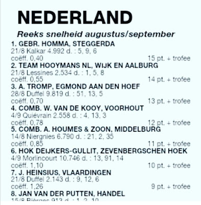 Arie stuurde voor de Gouden Duif zijn resultaten in van een vlucht uit Duffel met een coeff. van 0.70. Nazaten uit zijn ‘superkoppel’.