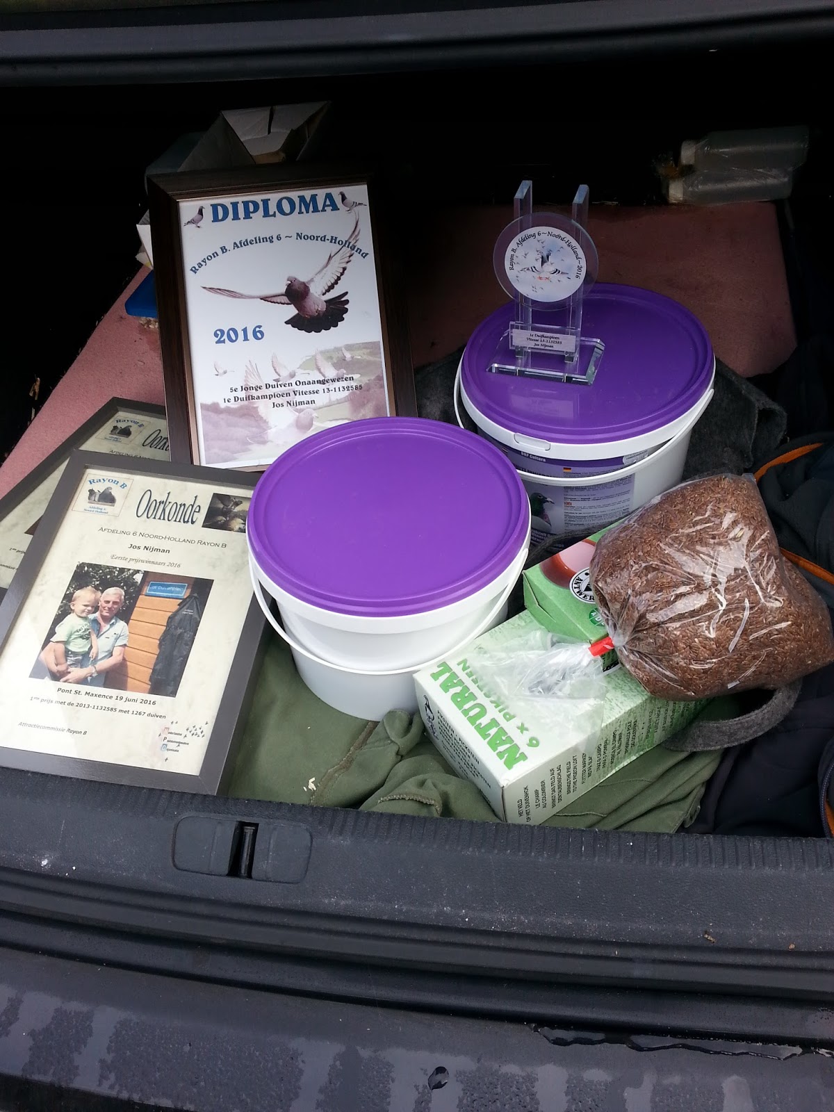 Zelf mocht ik ook naar voren komen en kreeg een diploma en plaquette voor de 1e Asduif Vitesse, een 1e prijs op Pont st Max en de 5e plaats in het kampioenschap ‘jonge duiven’, daarnaast nog een baal voer, 2 emmers mineralen en nog een prijs van de verloting. Ik was blij dat ik met de auto was en nam rond 19.15 afscheid.