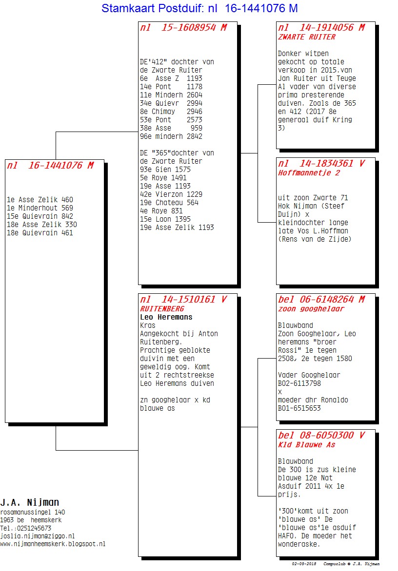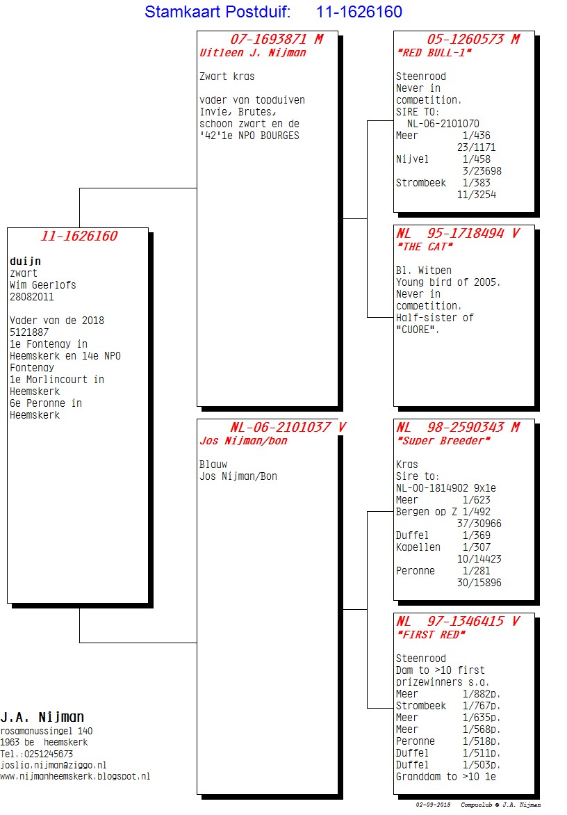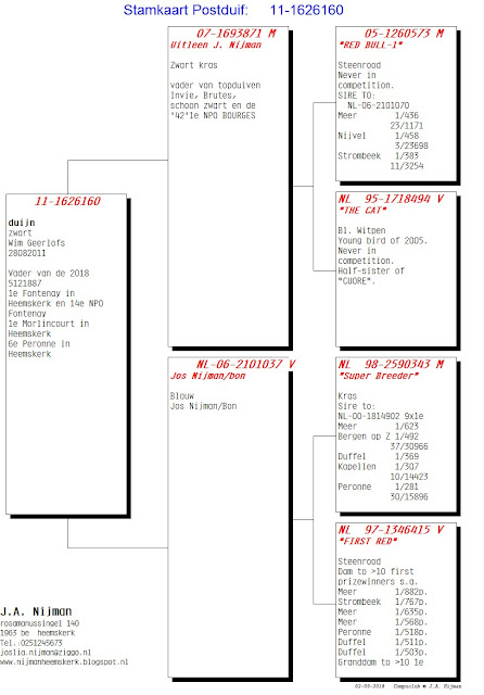 De eerste duif van mijn broer is een klzn van de Zwarte Ruiter doffer x een duivin van Anton Ruitenberg. De Zwarte Ruiterdoffer en de Kras 161 Ruitenberg zitten beiden op ons kweekhok en hebben al diverse 1e prijswinnaars op de wereld gezet. De ‘954’ wordt gespeeld door Peter maar de stamkaart is door mij opnieuw uitgedraaid.