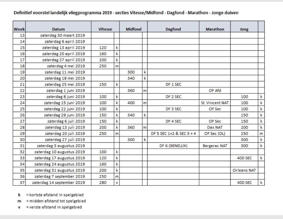 Hieronder het definitieve voorstel van het vliegprogramma, samengesteld door de ‘secties’. Ik ben er duidelijk in en juich het programma toe maar wel landelijk invoeren en wel gelijk, geen jaren meer wachten en sancties invoeren voor afdelingen die zich niet houden aan de afspraken. Het voorgestelde programma biedt zoveel mogelijkheden om je sport te beoefenen en aan te haken wanneer het je uitkomt. De Vitesse mannen moeten toch helemaal opbloeien, bijna alle weken sport! Natuurlijk tellen ze niet allemaal. Van week 23 t/m 29 lopen ze parallel met het jonge duiven programma dus een soort X vluchten. Week 32 t/m 37 is volgens mij de ‘natour’, prima om nog wat oude of je zomerjongen te spelen. Op de midfond en dagfond is niets schokkends te constateren en het jonge duivenprogramma biedt iedereen de kans om in te stappen wanneer hij door ziekte van zijn duifjes een paar weekjes verstek moet laten gaan en vind je het na 300 km welletjes, prima toch..
