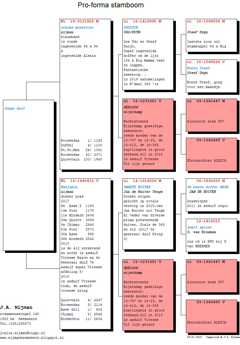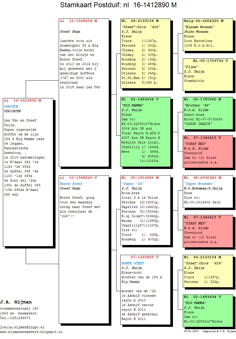 Het is alweer heel wat jaartjes geleden dat Steef een doffer bij mij in de ren gooide. Wat is dat er voor één Steef, vroeg ik. ‘Heeft te leen gezeten bij een liefhebber in de Noord, is nog een doffer uit de 54 x 94, heeft een geweldig oog voegde hij er nog aan toe. Het gebeurde wel meer dat Steef wat duiven kwam brengen die waren gekocht of wat probeersels, einde jaar vroeg ik aan Steef ‘kijk nog eens en wat kan weg’. Na de duiven nog eens bekeken te hebben, kon alles weg op één na, uit de terug gehaalde doffer moest ik gaan kweken. De doffer 10-254 werd gezet op de ‘Geeloog’ duivin (Eijerkamp) en later op de Merwe duivin, beide keren een schot in de roos! Helaas verspeelde ik de 508 maar de 747 zit inmiddels op het kweekhok. Toen Steef stopte met de actieve sport aan huis en met Lex Udo in combinatie ging spelen, kwam Steef bij mij langs. Jos, ik neem de ‘54’ mee naar Lex, prima Steef het is jouw duif en ik heb er al ‘goeie’ uit. Als laatste voegde ik eraan toe, komt er wel nog wat van terug….tuurlijk Jossie. Het zal ruim ‘n jaar later geweest zijn dat Steef belde en zei “neem even contact op met Lex, we hebben er 2 klaar zitten en zoek er maar één uit en trouwens ik heb lex voorspeld welke jij gaat meenemen…nou ik hoor het wel!’ Ik die week naar Lex toe, neem de duiven uit het mandje, beiden doffers, de één blauw bont, de andere een blauw witpenner. Wie is de moeder, vroeg ik aan Lex…een blauw bont duivinnetje, die Steef heeft meegebracht, antwoordde Lex. Bij mij ging een lampje branden, ken je de afstamming vroeg ik? Nee, dat hoor ik later wel, oké antwoordde ik want ik had wel een vermoeden om welk duifje het ging. Bekeek de doffers nogmaals en zei, ‘ik ga voor de bonte’. Nu dat voorspelde Steef al, maar waarom? Dat vraag je maar aan Steef zei ik met een lach. Ik was koud thuis en Steef belde mij, welke is het geworden? Die bonte doffer Steef, ik wist het zei Steef. Die Bonte doffer heeft namelijk dat speciale oog, die dat superkoppel 54 x 94 regelmatig gaf. Het Blokje, Bonte Steef, De 54 waren allemaal gezegend met die ogen en gaven echte goede nazaten.