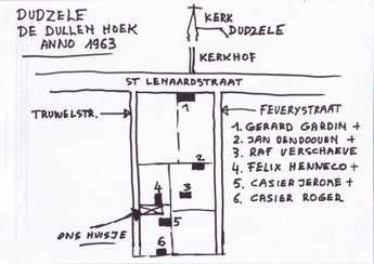In de Kerkstraat woonde de burgerij, de middenstand en de winkeliers , en in de straatjes het werkvolk .Wij woonden dus in de Truwelstraat , Gerard Gardin in de Kerkstraat , en Raf Verschaeve en Co in de Feverystraat , maar omdat de hovingen , langs achter, in elkaar liepen als het ware ,en aan elkaar paalden , kreeg je dus dat uniek beeld van duivenhokken , broederlijk naast elkaar,die de “Dullen Hoek “ uitmaakten !